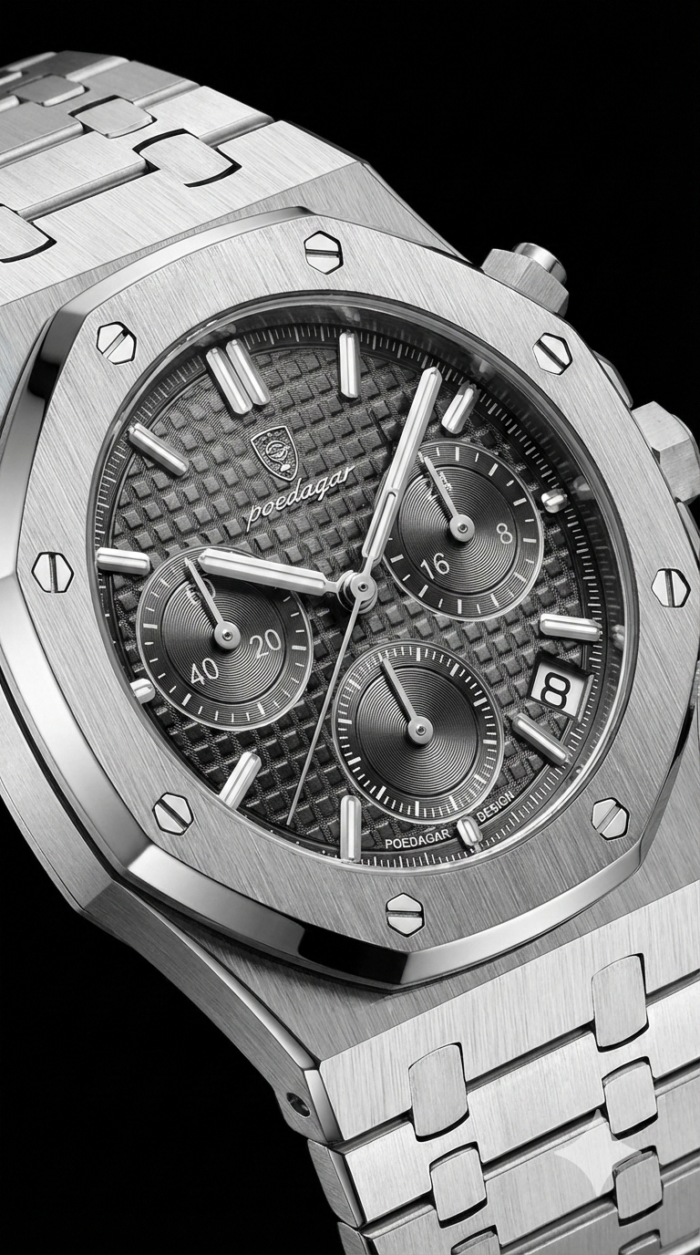 Il quadrante dalla trama geometrica cattura la luce con una profondità ipnotica, facendo da sfondo ideale a indici e lancette luminescenti. I tre sottoquadranti cronografici aggiungono un tocco di precisione tecnica, armonizzandosi con la finestrella del datario per un'estetica perfettamente bilanciata. Ogni dettaglio esprime una ricercatezza visiva che eleva l'eleganza sportiva e la leggibilità dell'intero segnatempo.
