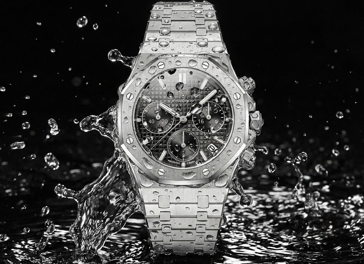 Resistenza all'acqua fino a 3 ATM, adatta all'uso quotidiano e in grado di sopportare schizzi, pioggia o brevi contatti con l'acqua, senza compromettere affidabilità dell'orologio.